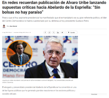La nota de Infobae, titulada ‘En redes recuerdan publicación de Álvaro Uribe lanzando críticas hacia Abelardo de la Espriella: ‘Sin bolsas no hay paraíso’’ ha distorsionado completamente el contexto y el significado de los mensajes, en un ejercicio de desinformación que atenta contra la rigurosidad periodística.