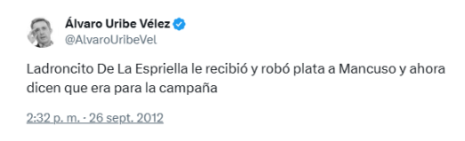 Infobae cita una publicación del expresidente Álvaro Uribe Vélez del 12 de septiembre de 2012, que dice: “Ladroncito De La Espriella le recibió y robó plata a Mancuso y ahora dicen que era para la campaña”. El medio sugiere que este mensaje iba dirigido a Abelardo De La Espriella.