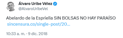 El segundo error de Infobae radica en citar el trino de Álvaro Uribe Vélez del 9 de diciembre de 2018: “Abelardo de la Espriella SIN BOLSAS NO HAY PARAÍSO”, presentándolo como una crítica o cuestionamiento hacia el abogado.