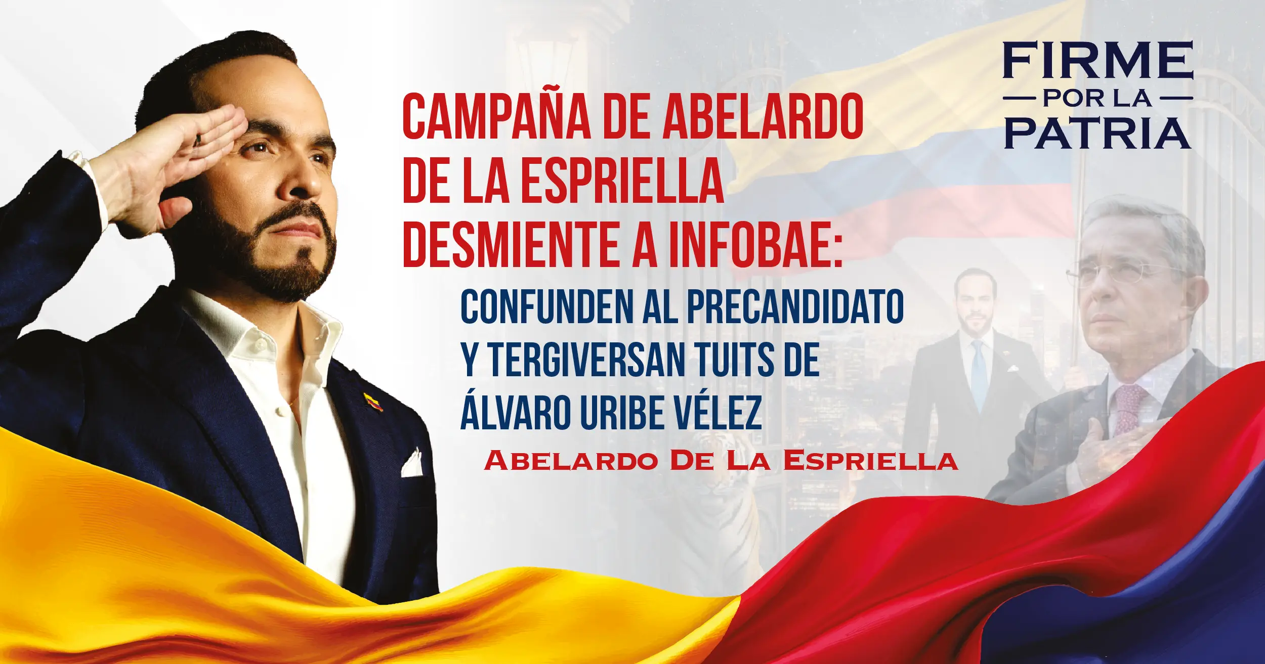 El movimiento ciudadano Defensores de la Patria que respalda al candidato presidencial Abelardo De La Espriella desmiente categóricamente la información publicada por el medio digital Infobae, que incurre en graves errores fácticos al confundir al precandidato presidencial con otra figura pública y al tergiversar el significado de un trino del expresidente Álvaro Uribe Vélez.