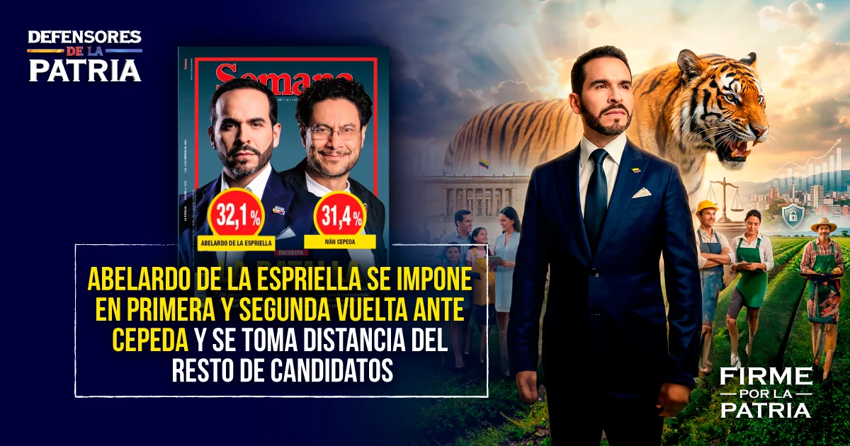 La encuesta no solo ubica a Abelardo De La Espriella en el primer lugar de la primera vuelta, sino que además proyecta un escenario ganador en segunda vuelta, donde el candidato mantiene la delantera.