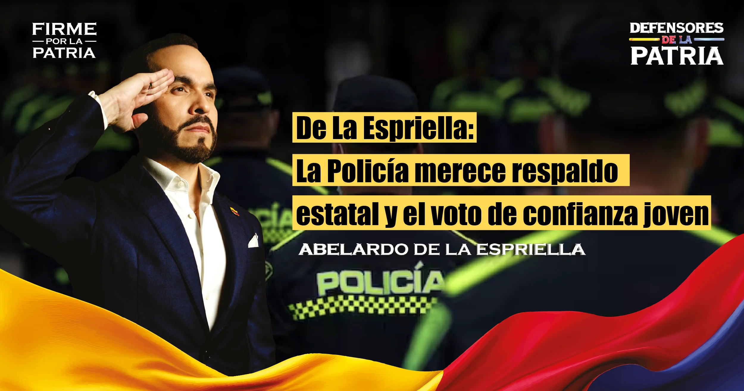 La seguridad y la dignidad de nuestra fuerza pública son la base sobre la cual levantaremos la Nación Milagro. Si crees que nuestros policías merecen un gobierno que los respalde con determinación y que trabaje por mejorar sus condiciones de vida y las de sus familias, tu lugar es con nosotros. Te invitamos a sumarte al movimiento Defensores de la Patria y a apoyar la candidatura presidencial de Abelardo De La Espriella. Es el momento de devolverle el orgullo a quienes nos cuidan y de votar con la convicción de que el orden es el primer paso hacia la libertad. ¡Únete a la victoria y defendamos juntos a nuestros héroes con la fuerza del tigre! ¡Inscríbete hoy mismo y haz parte del cambio real!