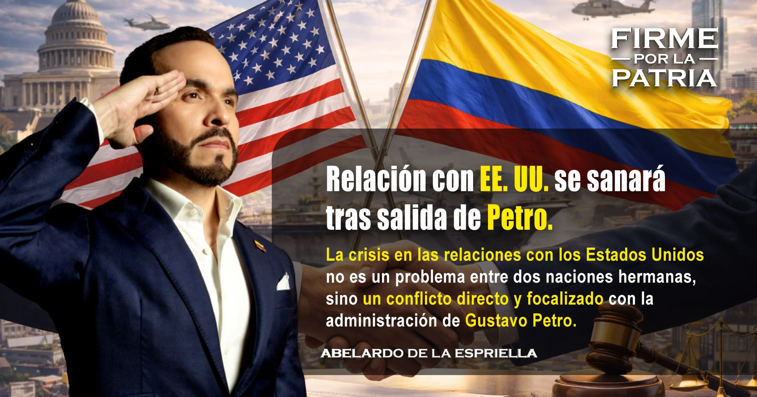 Abelardo De La Espriella, candidato presidencial y líder del movimiento Defensores de la Patria, ha sido claro al señalar que la crisis en las relaciones con los Estados Unidos no es un problema entre dos naciones hermanas, sino un conflicto directo y focalizado con la administración de Gustavo Petro.