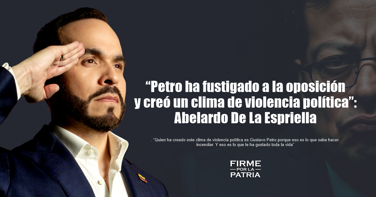 “Petro nos ha llamado ‘nazis’ a los miembros de la oposición, se ha parado en tarima a gritar ‘vencer o morir’ y ha enarbolado la bandera de la muerte y la espada de Bolívar. Además, atacó varias veces de forma directa a Miguel Uribe, lo fustigó”, denuncia De La Espriella.